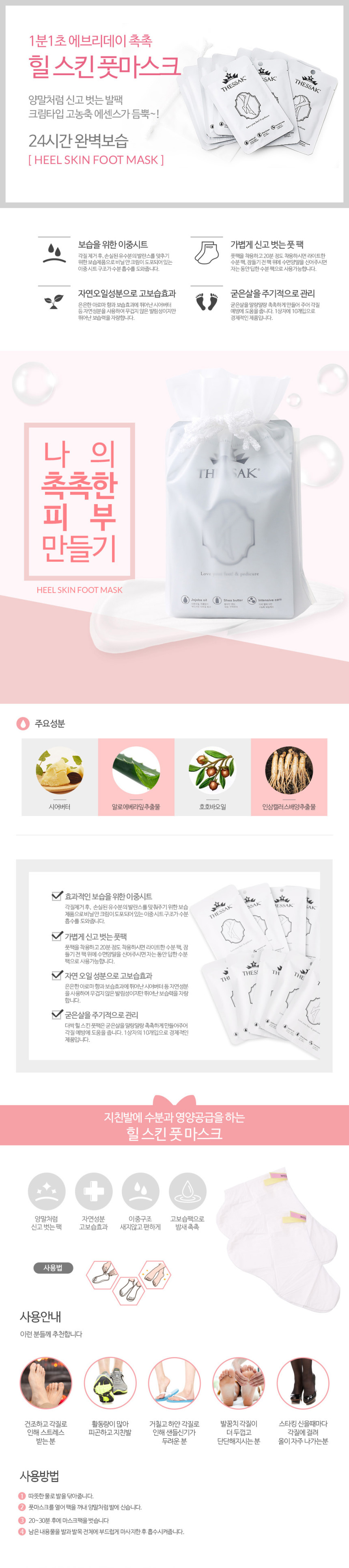 | 사용방법 | ① 따뜻한 물로 발을 닦아줍니다. ② 풋마스크를 열어 팩을 꺼내 양말처럼 발에 신습니다. ③ 20~30분 후에 마스크팩을 벗습니다. ④ 남은 내용물을 발과 발목 전체에 부드럽게 마사지한 후 흡수시켜 줍니다. |