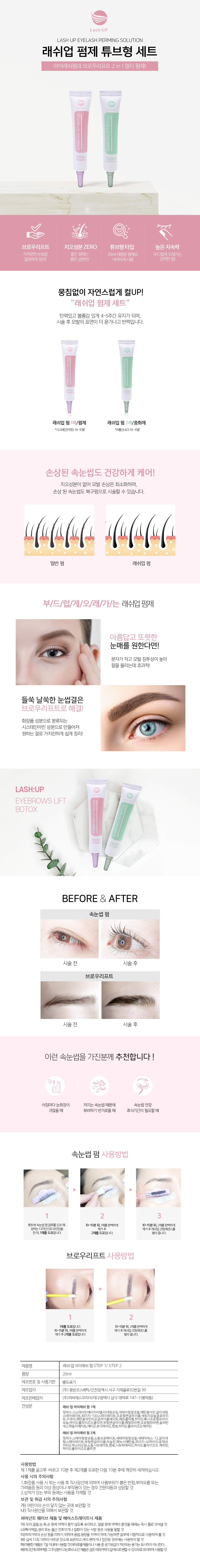 | 사용방법 | [속눈썹펌] ① 롯드에 속눈썹 펌 글루를 도포 해 원하는 디자인으로 와인딩을 한 뒤, 1제를 도포합니다. ② 10~15분 뒤, 1제를 완벽하게 제거 후 2제를 도포합니다. ③ 10~15분 뒤, 2제를 완벽하게 제거 후 래쉬업 코팅에센스를 발라 줍니다. [브로우리프트] ① 1제를 도포합니다. ② 10~15분 뒤, 1제를 완벽하게 제거 후 2제를 도포합니다. ③ 10~15분 뒤, 2제를 완벽하게 제거 후 래쉬업 코팅에센스를 발라 줍니다. |